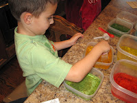 We did a color mixing project today. I got the idea from The Pioneer Woman’s homeschooling blog. I provided them with Blue, Red and Yellow water, and then gave them ‘recipe’ cards to work from. Just because I don’t trust my kids with that large a quantity of water, I had them use smaller cups to do their measuring.
