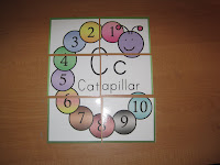 Color matching and upper/lowercase matching caterpillar puzzles. Since the capital C and lowercase c are basically the same, I just added them to the color puzzles. I printed it, laminated it then cut the caterpillars out then cut them in half.
