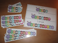 A fun size sorting game, I have her put the correct size caterpillar on the game board, but you could also have them put the sizes in order from big to small, or small to big.