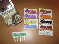Caterpillar Clip Cards:Β I got the mini-clips from Wal-mart craft section, but she also has colorful paperclips she uses as well. Really you could use anything, even bingo markers or beans, etc. Just put the correct amount on the card based on the number.
