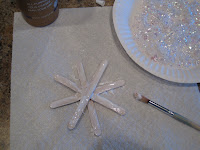 2. Once snowflakes are dry, add a thick layer of glue or modge podge to one whole side of the snowflake. Cover everything well.