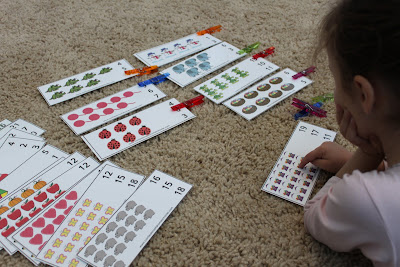 1-20 Clothes Pin Counting Cards: I found some fun colored clothes pins at an office supply store a few weeks back. My daughter counts the items on the card then puts a clip on the correct number.