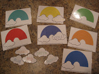 Color Puzzles: I cut these little guys out then cut them in half in as many interesting ways as I could think of to make tiny color matching puzzles. For older kiddos, page 2 of this download includes clouds with color words on them, so you can have them match the correct color to the word.