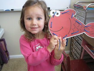 Fish Lacing Card: I make sure to laminate this one for durability, then punch with a hole punch every inch or so for lacing practice. Teach them patterns to do with this as well, like up from the bottom each time, or in-out-in-out…I did both in this picture to illustrate: