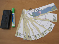 Fish Clip Cards: I use these with either mini-clothes pins, colored paper clips, or put a hole in them and have her attach chain links to them. This time we’ll use goldfish to put on the cards. Whatever you use, just have them put on the correct amount for the number on the card. These are also good for having them put in numerical order.